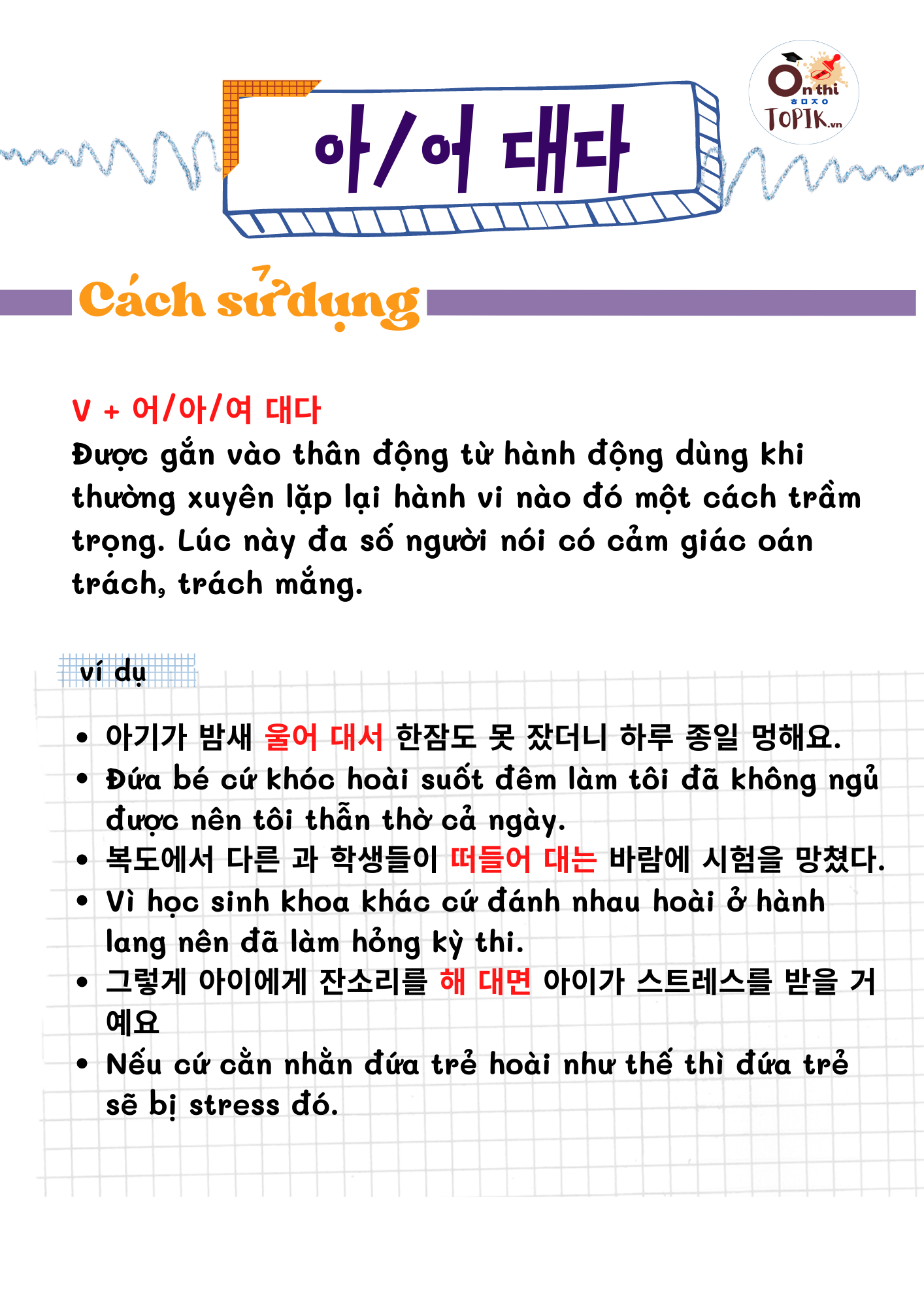 1, [NGỮ PHÁP]-아/어 대다