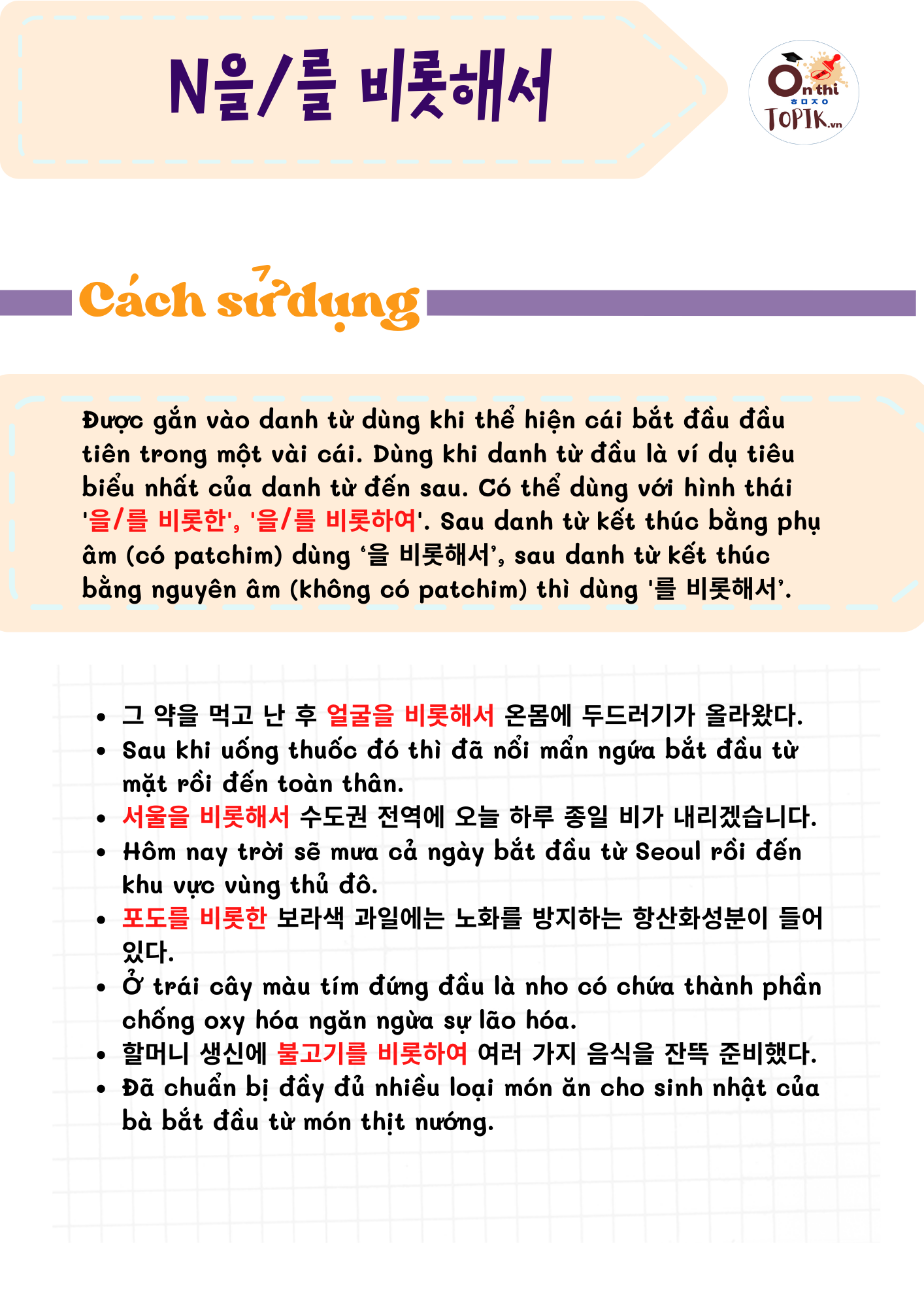 Được gắn vào danh từ dùng khi thể hiện cái bắt đầu đầu tiên trong một vài cái. Dùng khi danh từ đầu là ví dụ tiêu biểu nhất của danh từ đến sau. Có thể dùng với hình thái '을/를 비롯한', '을/를 비롯하여'. Có thể dịch trong tiếng việt là từ….đến